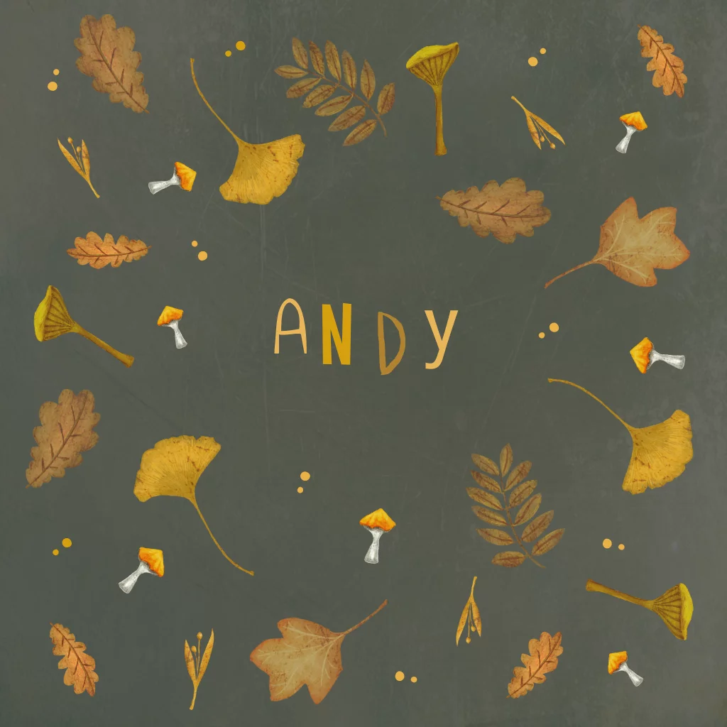 Geboortekaartje Andy, met een patroon van blaadjes, paddestoelen en stippen op een vintage grijs groene achtergrond met gekkie grappige typografie.
