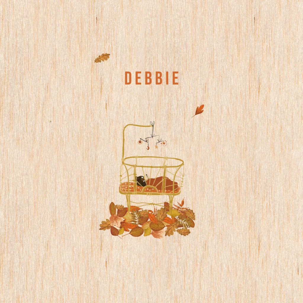 Fijn geboortekaartje Debbie, met baby beertje in de wieg op een bedje van herfstbladeren. Mooi natuurlijk kaartje door de houtnerf