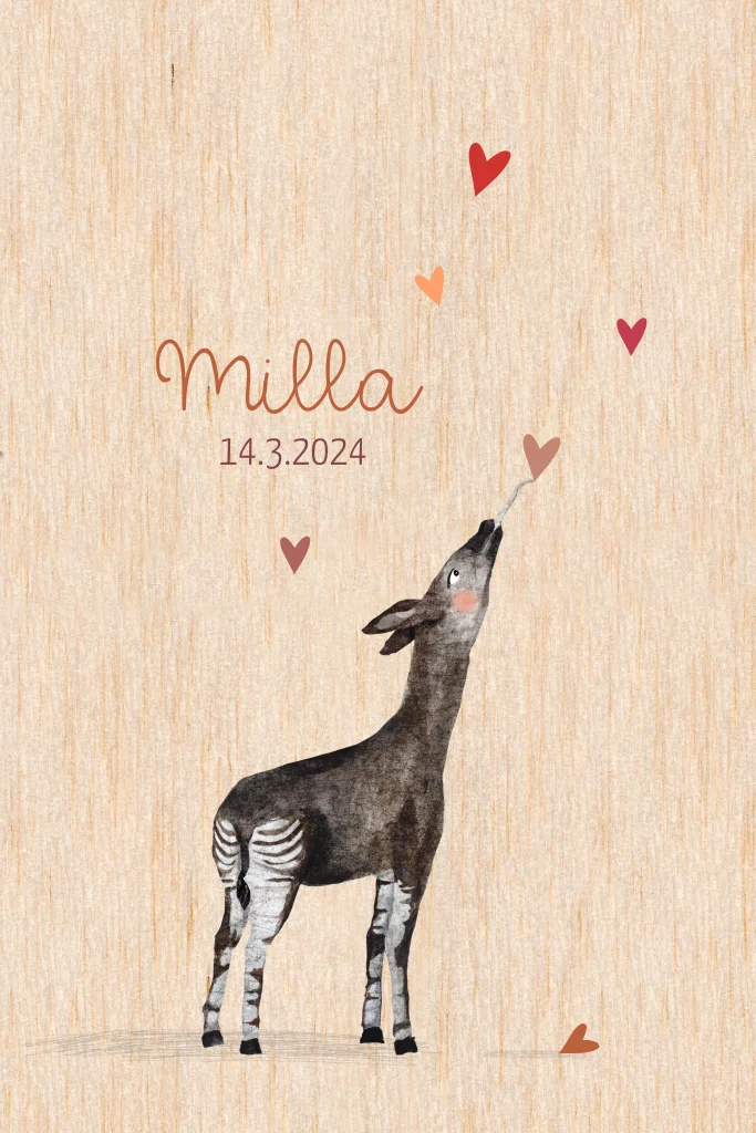 Houten geboortekaartje met een okapi en gekleurde hartjes. Grappig lief kaartje voor jongens en meisjes