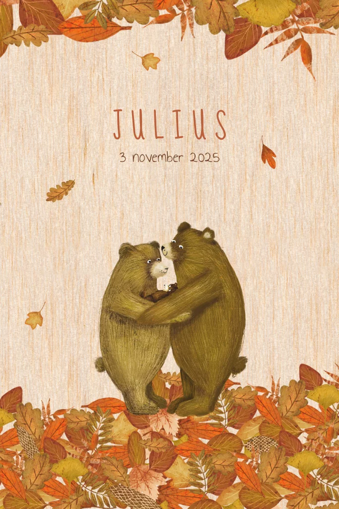 Lief geboortekaartje van echt hout Julius met vader en moeder beer met een babybeertje. Mooie warm gekleurde herfstbladeren dwarrelen om hen heen.