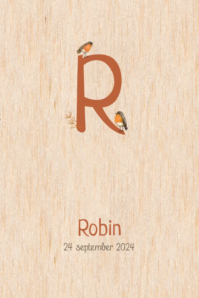Lief geboortekaartje Robin met initiaal en roodborstjes op hout