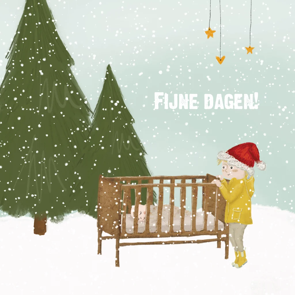 Kerstkaartje met baby en kindje in de sneeuw. Maak je persoonlijke kerstkaartje helemaal naar wens met de illustraties van Studiopie
