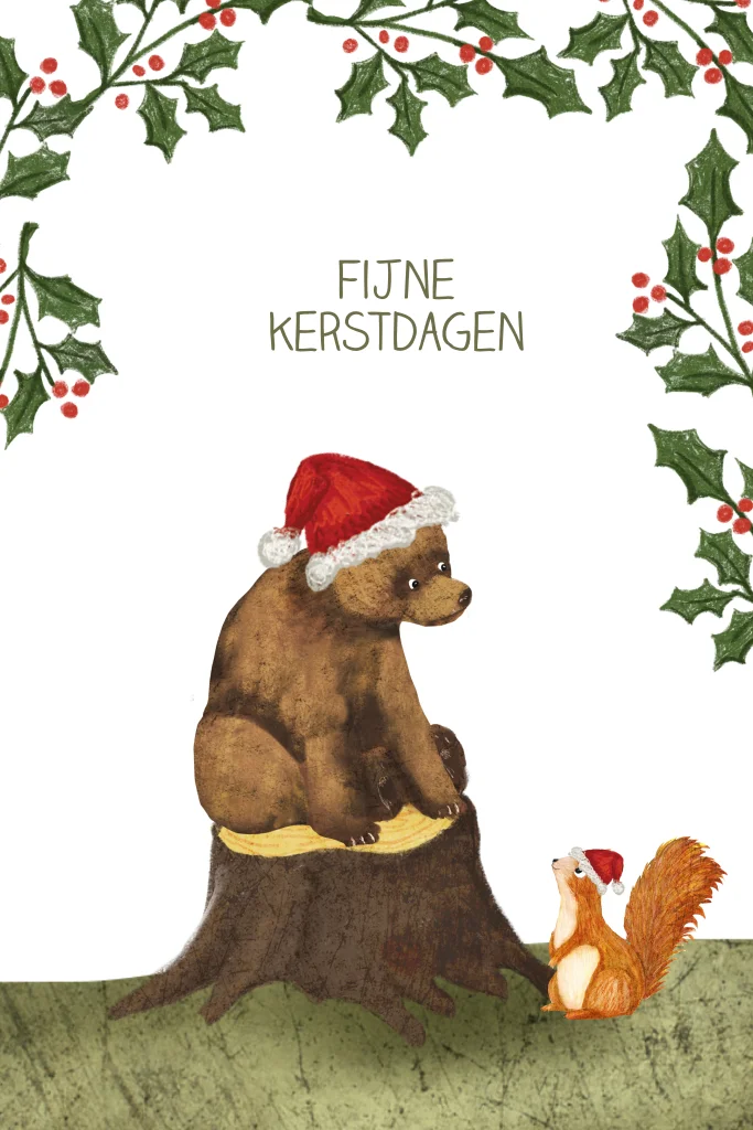 Kerstkaartje met beer en eekhoorn met kerstmuts en hulst