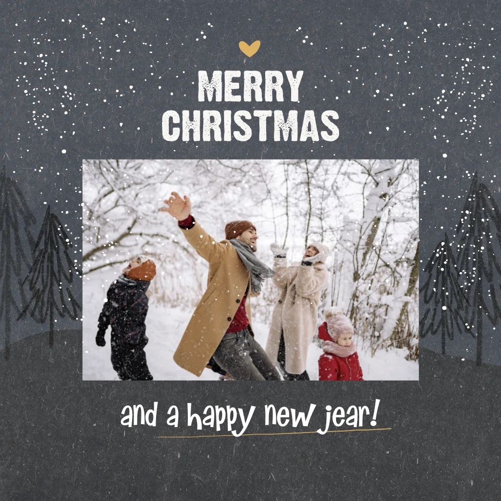 Gevouwen kerstkaartje met foto op donkerblauw met zilverfolie details. Je vervangt de foto eenvoudig en past de tekst aan om het helemaal eigen te maken!