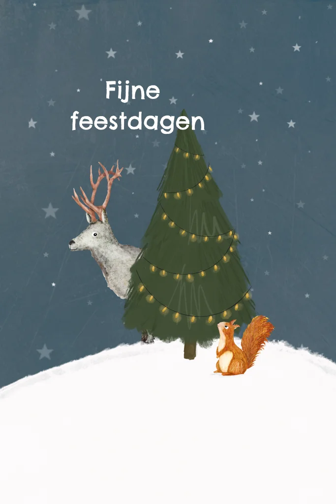 Kerstkaartje met kerstboom, eekhoorntje en rendier