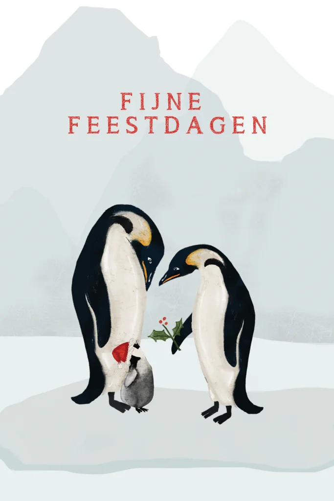 Kerstkaartje met pinguinfamilie. In de beeldbank staat ook een illustratie met twee kindjes. Maak dit kerstkaartje helemaal persoonlijk.