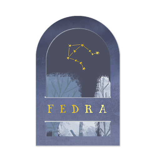 Insteek labelkaartje Fedra met sterrenbeeld op paarsblauwe achtergrond met goudfolie sterren.