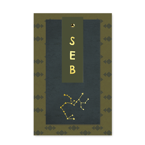 Labelkaart Seb, met vintage patroontje in olijfgroen en sterrenbeeld waterman in goudfolie. Een bijzonder sterrenbeeld geboortelabel die je zelf kunt aanpassen!