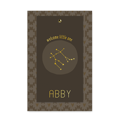 Stapel geboortelabel Abby met een sterrenbeeld tweeling in goudfolie en een retro bruin patroon.