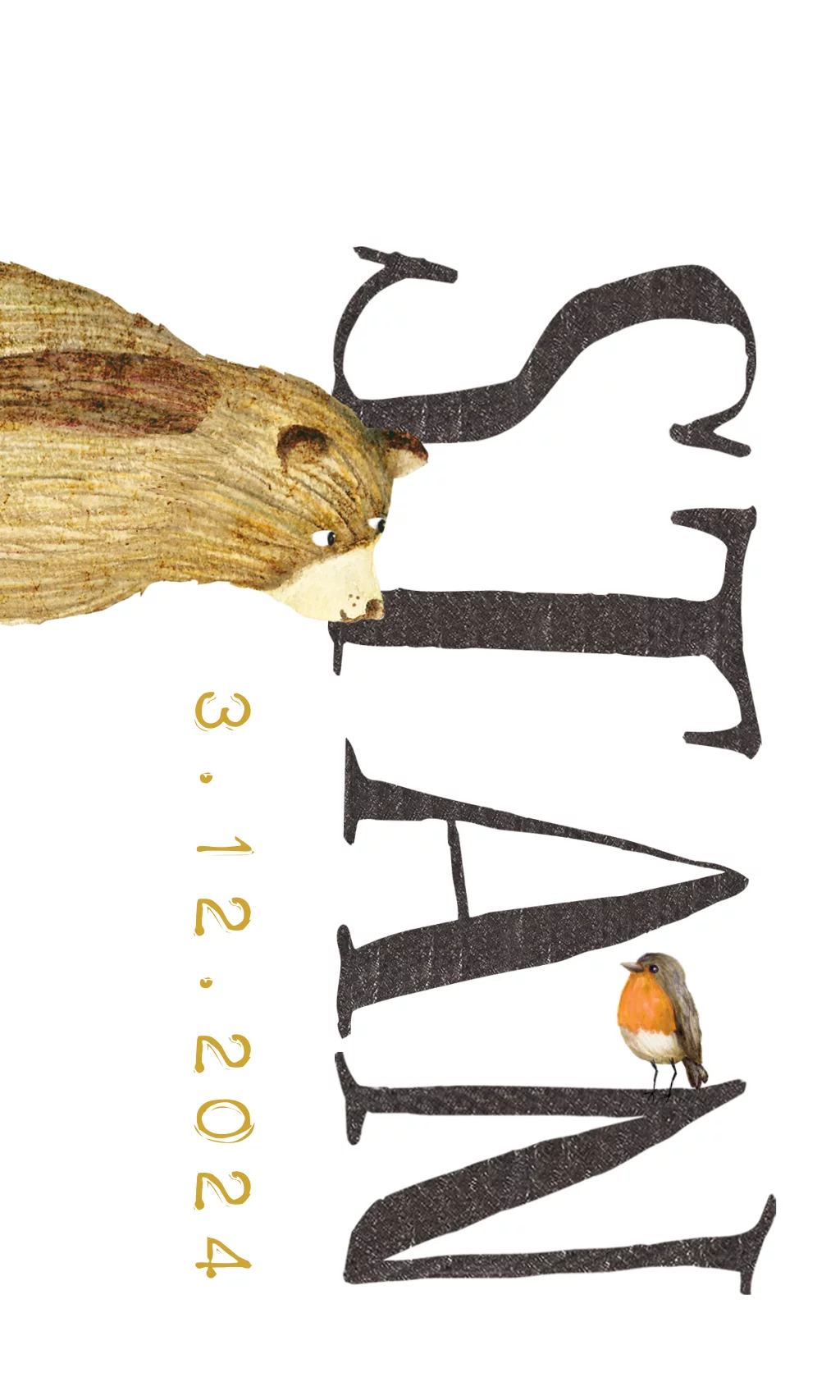 Staand labeltje met tekening van beer en roodborstje dat je zelf kunt ontwerpen bij je geboortekaartje, een traktatie of een doopsuiker.