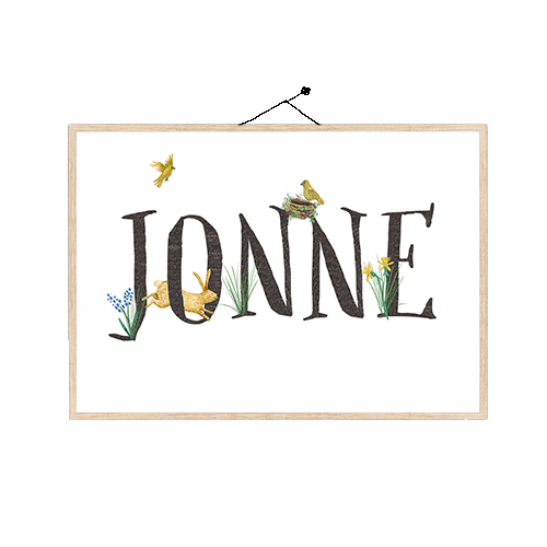 Naamposter met een vogelnestje en een springend konijntje. Lekker lente! De naam pas je eenvoudig aan via de editor. Maak een prachtige poster voor de kinderkamer. Ook leuk als kraamcadeautje! Excl. lijst