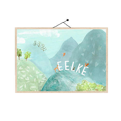 Poster met schildering van bergen in de zomer met grote letters versierd met bosdieren zoals een eekhoorn en hertje.