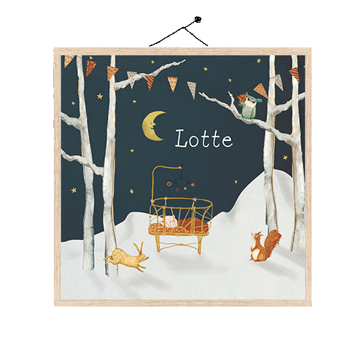 In dit winterse postertje kijken de bosdieren nieuwsgierig naar het baby'tje in het rotan wiegje midden in het bos in de sneeuw. Je past de poster eenvoudig aan in de editor.