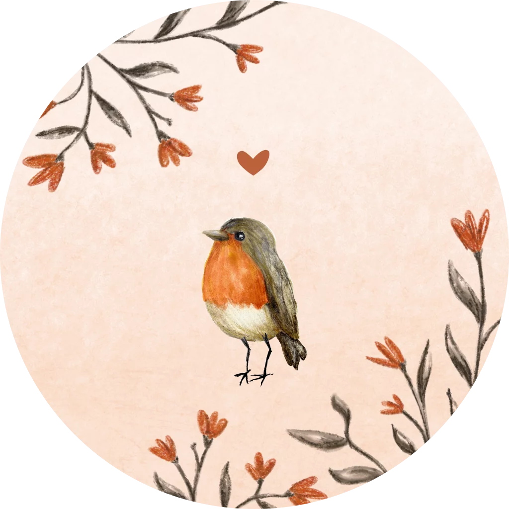 Sluitzegel met roodborstje, hartje en bloemetjes op roze waterverf achtergrond. Je kunt deze sluitsticker zelf aanpassen