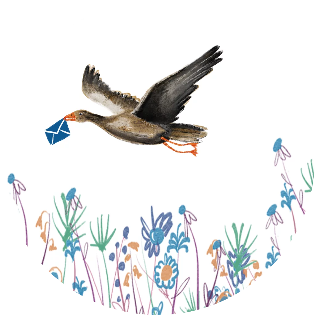 Sluitzegel met vliegende gans met post in zijn bekje over blauwe en groene heuvels met bloemen
