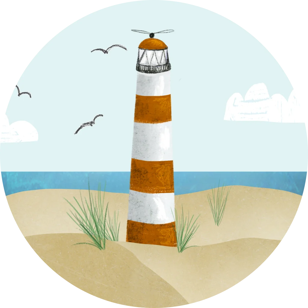 Sluitzegel met met vuurtoren op het strand en zeemeeuwen in de verte