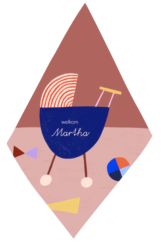 Geboortekaartje Martha in een bijzondere ruitvorm met een kinderwagen in babykamer. Pas je ontwerp helemaal naar wens aan met de prachtige illustraties van Anna Katharina Jansen
