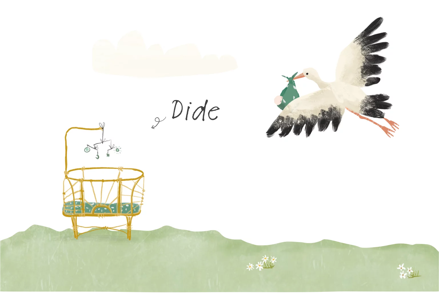 Geboortekaartje met bijzondere vorm Dide. De ooievaar brengt een baby en legt 'm in het rotan wiegje.