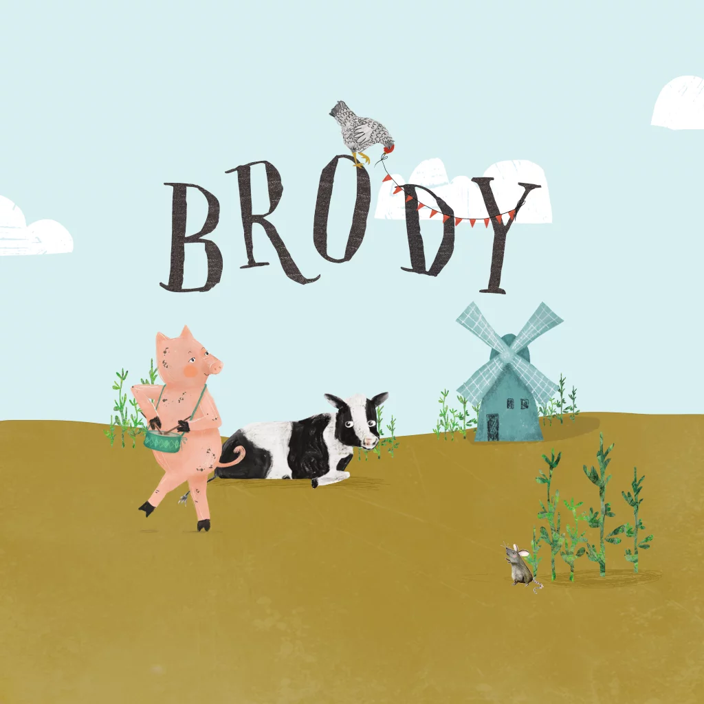 Boerderij geboortekaartje Brody met grote letters en in de vorm van een bloem. Met mooie illustraties van boerderij dieren, een kip houdt een slingertje vast, een varken, een kalfje en een muis.
