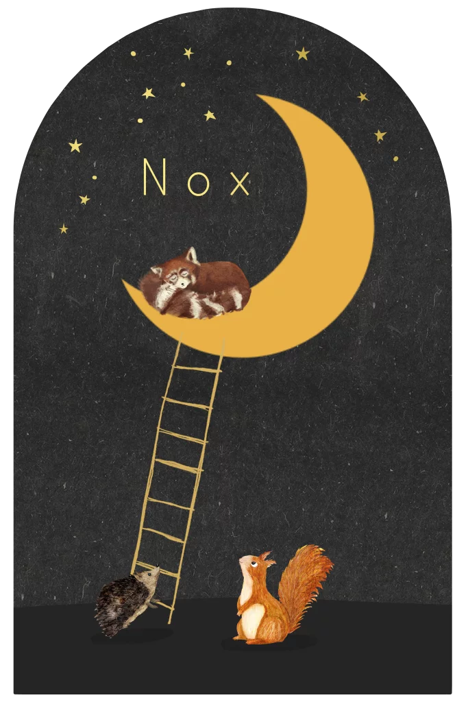 Geboortekaartje in een boogvorm met een laddertje naar de maan waar een rode panda op ligt te slapen. De egel en de eekhoorn klimmen op de ladder. Aan de hemel staan sterren van goudfolie. Wat een lief geboortekaartje voor jouw zoon. Je past het kaartje zelf gemakkelijk aan in de editor.