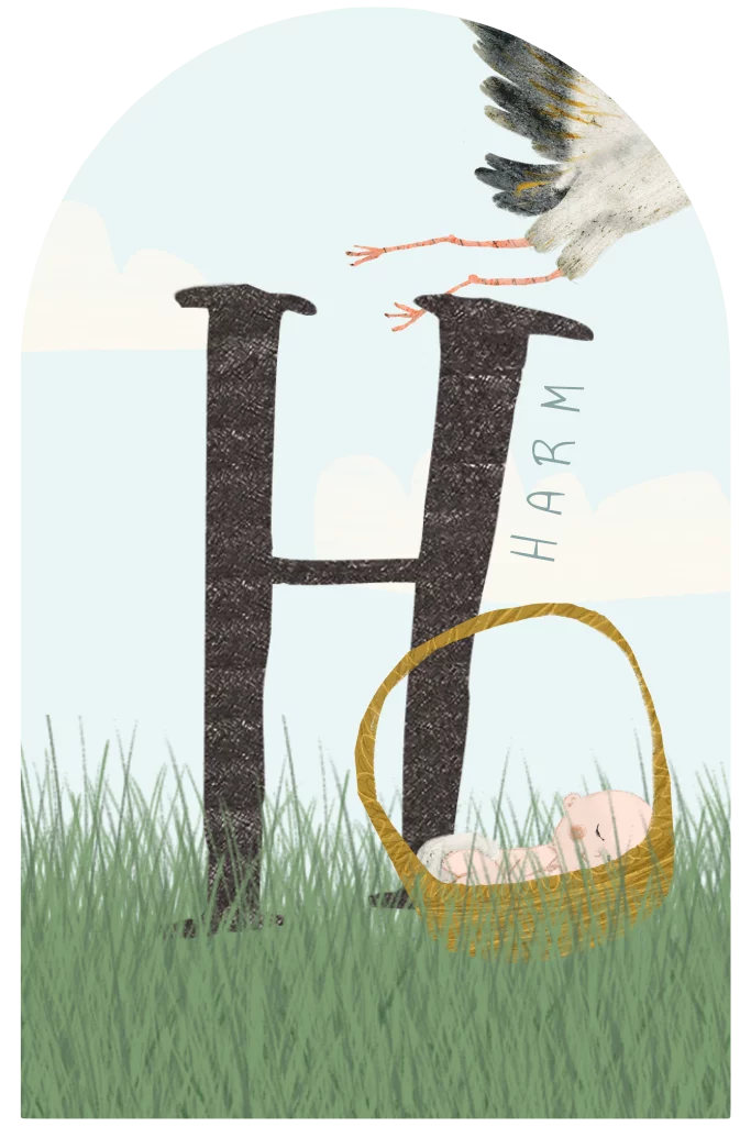 Geboortekaartje boog Harm met baby in een mandje in het gras naast een grote initiaal, de ooievaar vliegt weg . Er staan meerdere kindjes in de beeldbank!