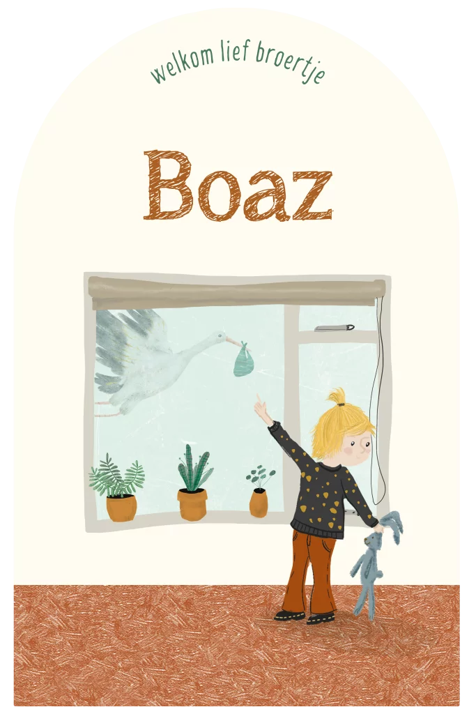 Schattig geboortekaartje Boaz, met een zus die naar buiten kijkt en de ooievaar ziet wegvliegen. Je kunt dit kaartje zelf naar wens aanpassen.