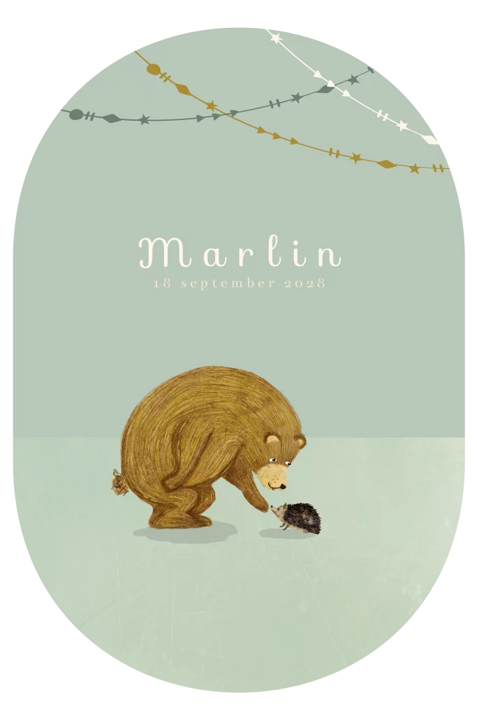 Ovaal geboortekaartje Marley met tekening van een beer en egel en slingertjes met bohemian tintje. Mooi Indian summer sfeertje. De structuren van achtergrond zijn heel mooi op soft touch papier.