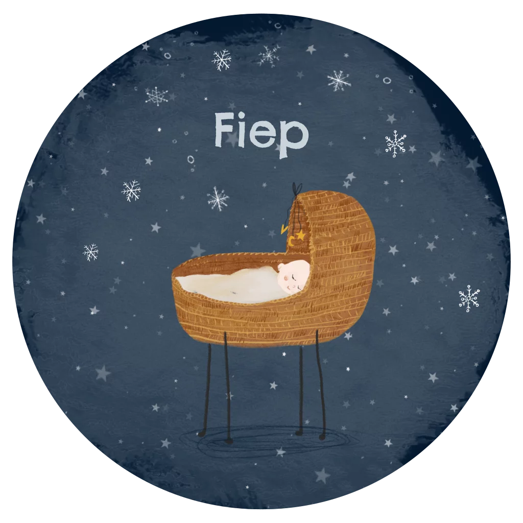 Geboortekaartje rond Fiep met een baby in een wiegjes onder de sterrenhemel in de nacht met sneeuwvlokjes. Een magisch geboortekaartje voor jullie kindje!