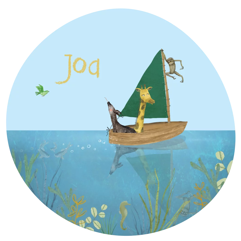 Bijzonder geboortekaartje Joa, in de vorm van een cirkel met illustraties van de zee, een zeilbootje en giraf, aap en okapi. Het avontuur kan beginnen!