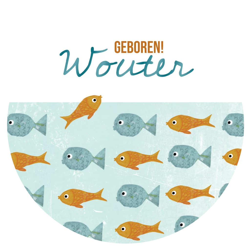 Rond geboortekaartje Wouter met visjes in de zee in mooie terra en mintgroene kleur.