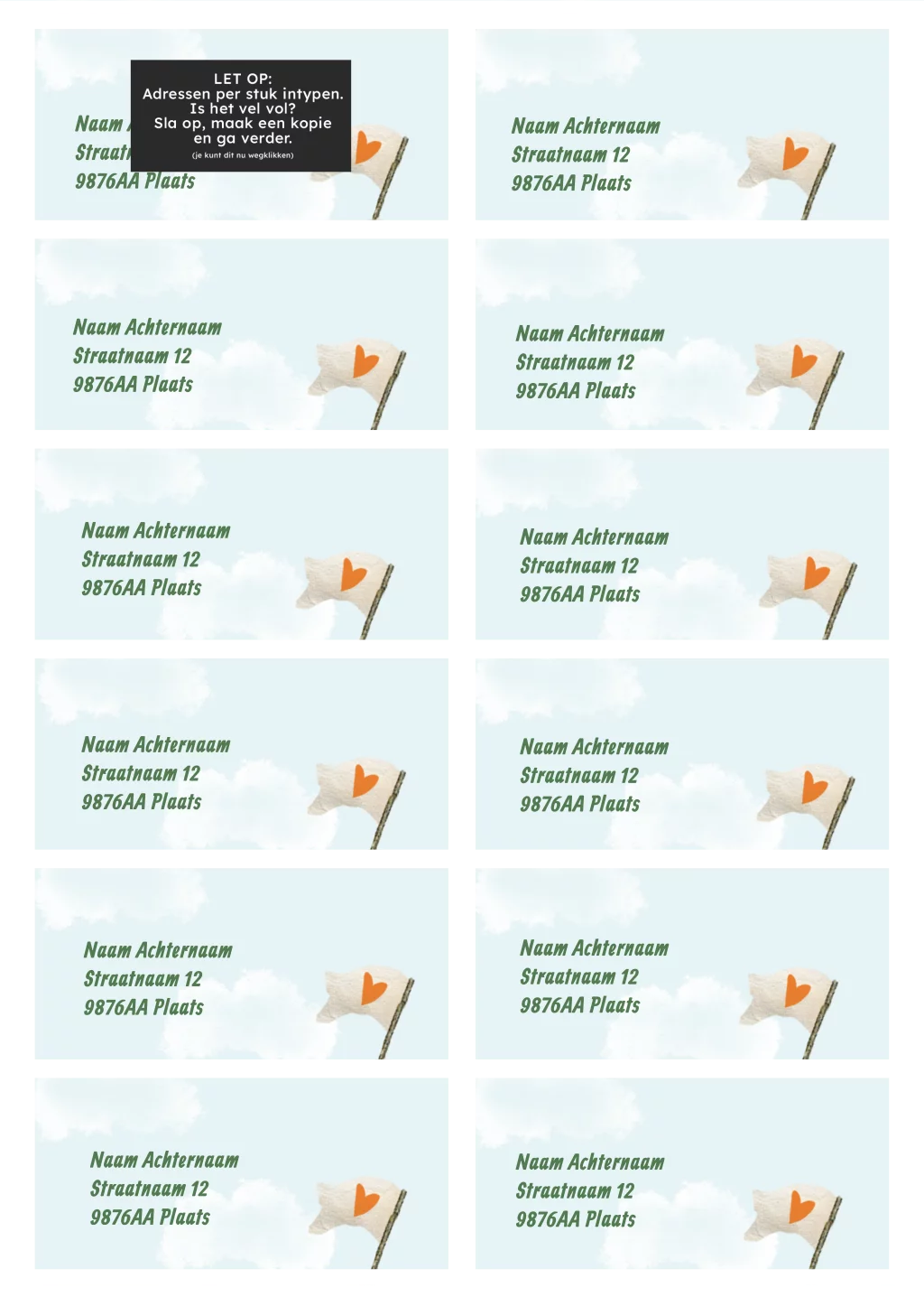 Je kunt hier zelf de adressen in voegen en het ontwerp naar wens aanpassen. Formaat 97 x 45 mm en 12 per vel