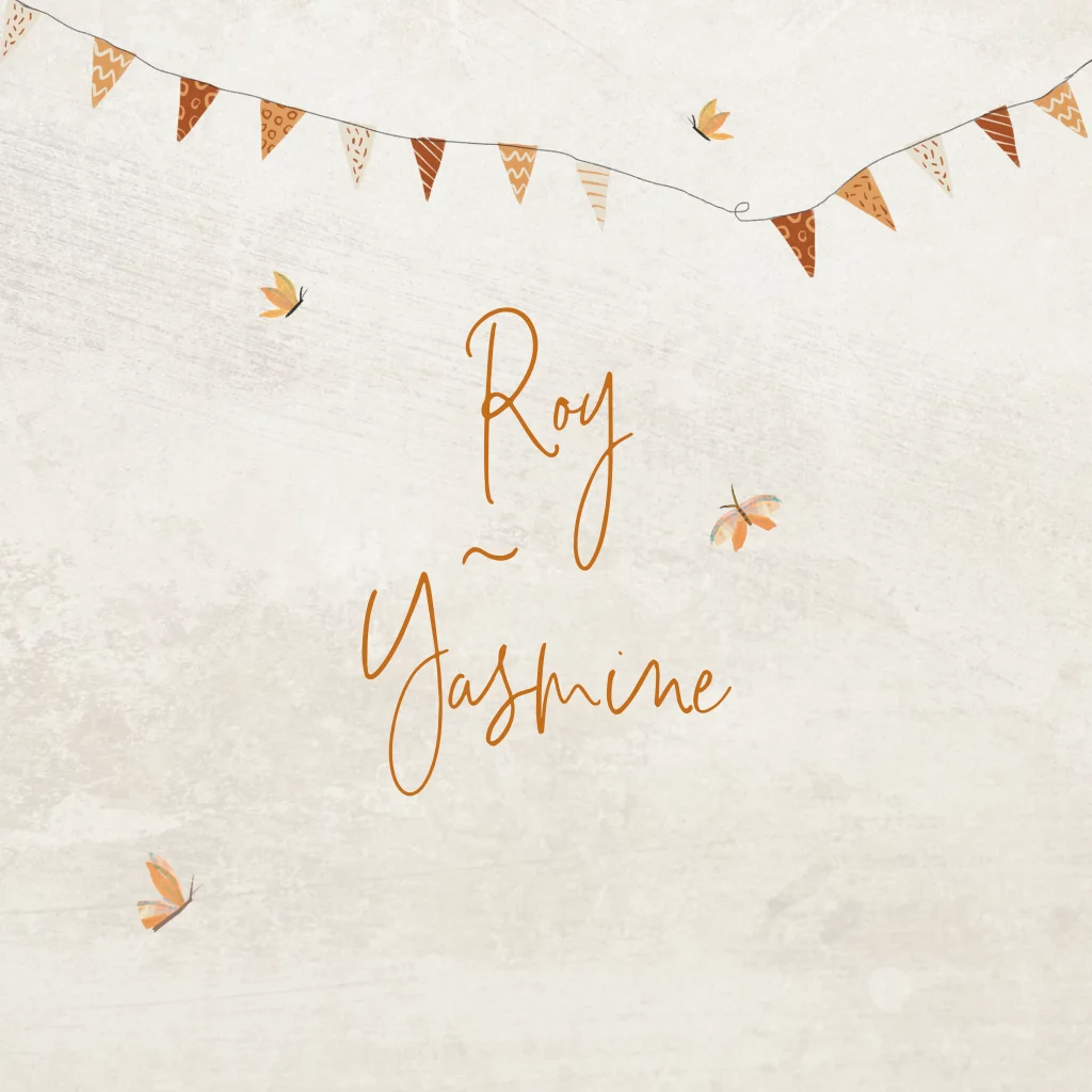 Romantische boho save the date kaart met , bloemen, vlinders en vlaggetjes. Met zachte, natuurlijke kleuren en een speelse, vintage uitstraling. Past bij de trouwkaart van Roy en Yasmine
