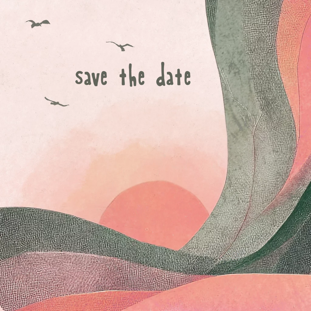 Save the date kaartje met retro geschilderde heuvels met een ondergaande of opkomende zon en vogeltjes in de lucht in roze, olijfgroen en auberginekleur.