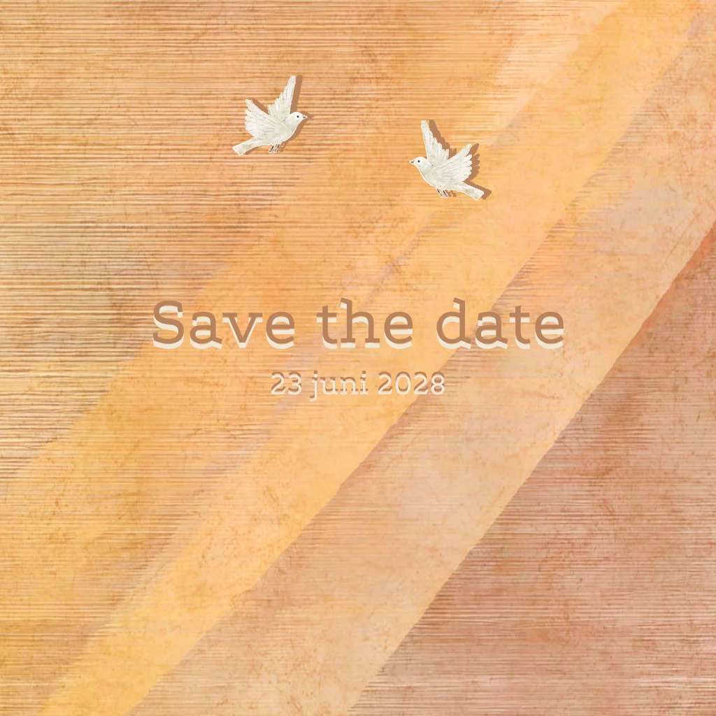 Save the date kaart tortelduiven abstract zonnestralen in aardetinten