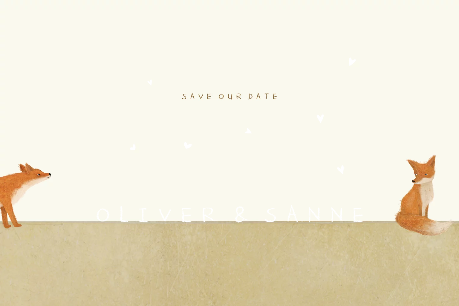 Speelse save the date met illustratie van twee vossen en kleine gouden hartjes in een minimalistische stijl. Perfect voor een romantische bruiloft met een natuurlijke en speelse uitstraling. Past bij de trouwkaart