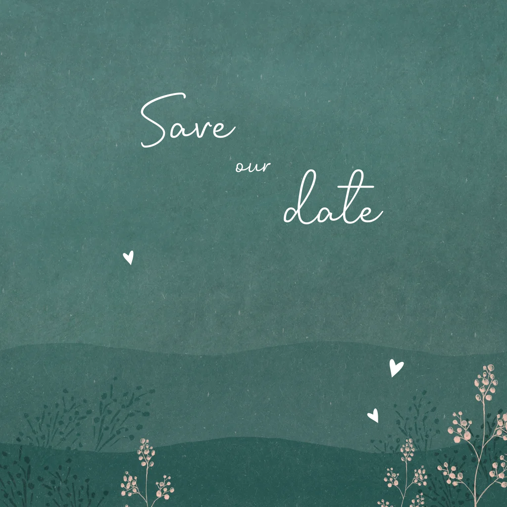 Een stijlvolle save the date kaart roze met petrol met silhouette van bloemen en zachte hartjes op een serene, donkere achtergrond.
