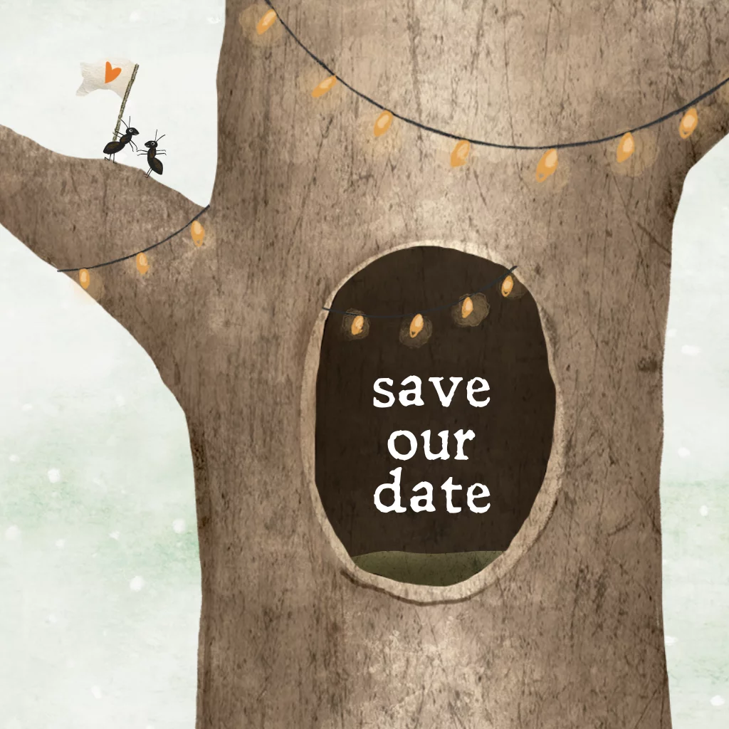 Winterse save the date kaart met illustratie van twee mierenop een boomtak met lichtejes versierd. Perfect passend bij de trouw uitnodiging van Linda en Ronald