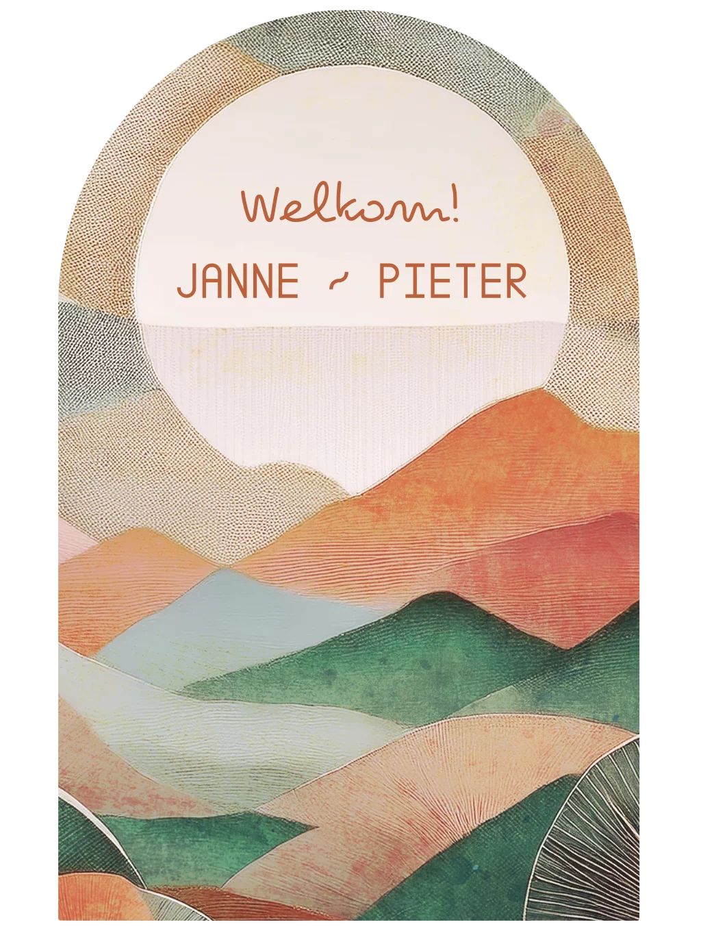 Welkomsbord bruiloft Janne en Pieter retro heuvels en witte zon