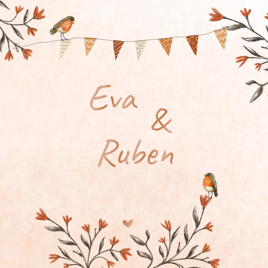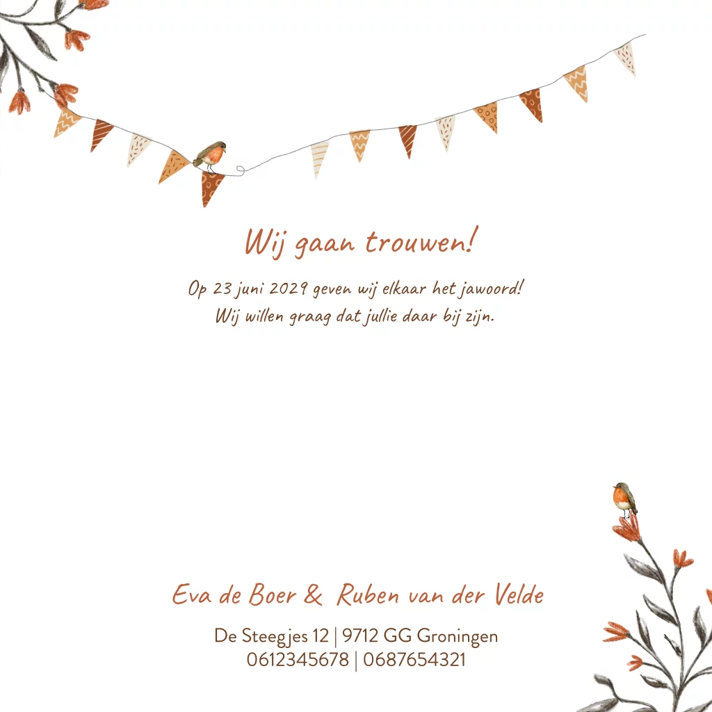Charmante trouwkaart met illustraties van roodborstjes, bloemen en vlaggetjes in zachte, natuurlijke tinten en hoogglans details. Deze kaart heeft een landelijke en sfeervolle uitstraling, ideaal voor een romantische bruiloft.