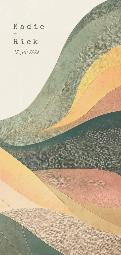 Minimalistische trouwkaart met abstract gelaagd landschap in zachte aardetinten. Deze kaart heeft een moderne en rustieke uitstraling, perfect voor een stijlvolle bruiloft geïnspireerd door de natuur