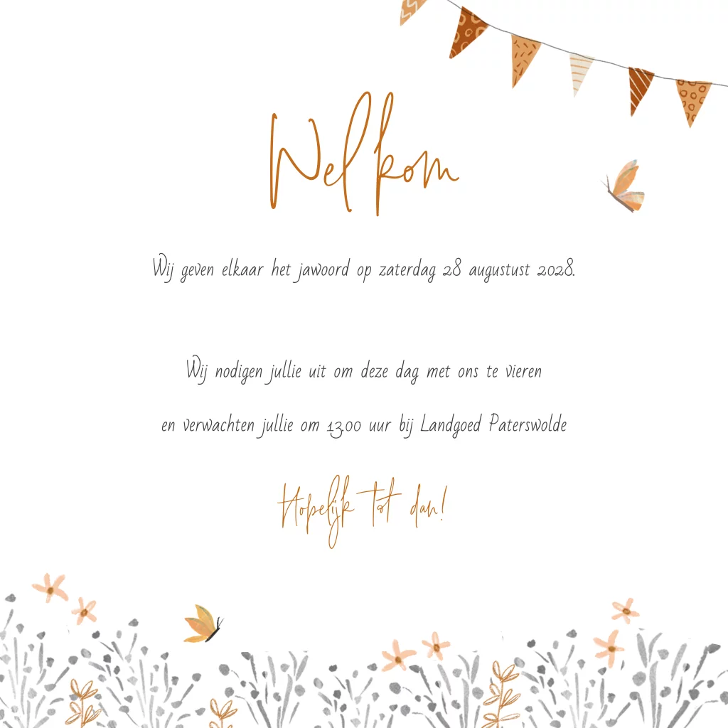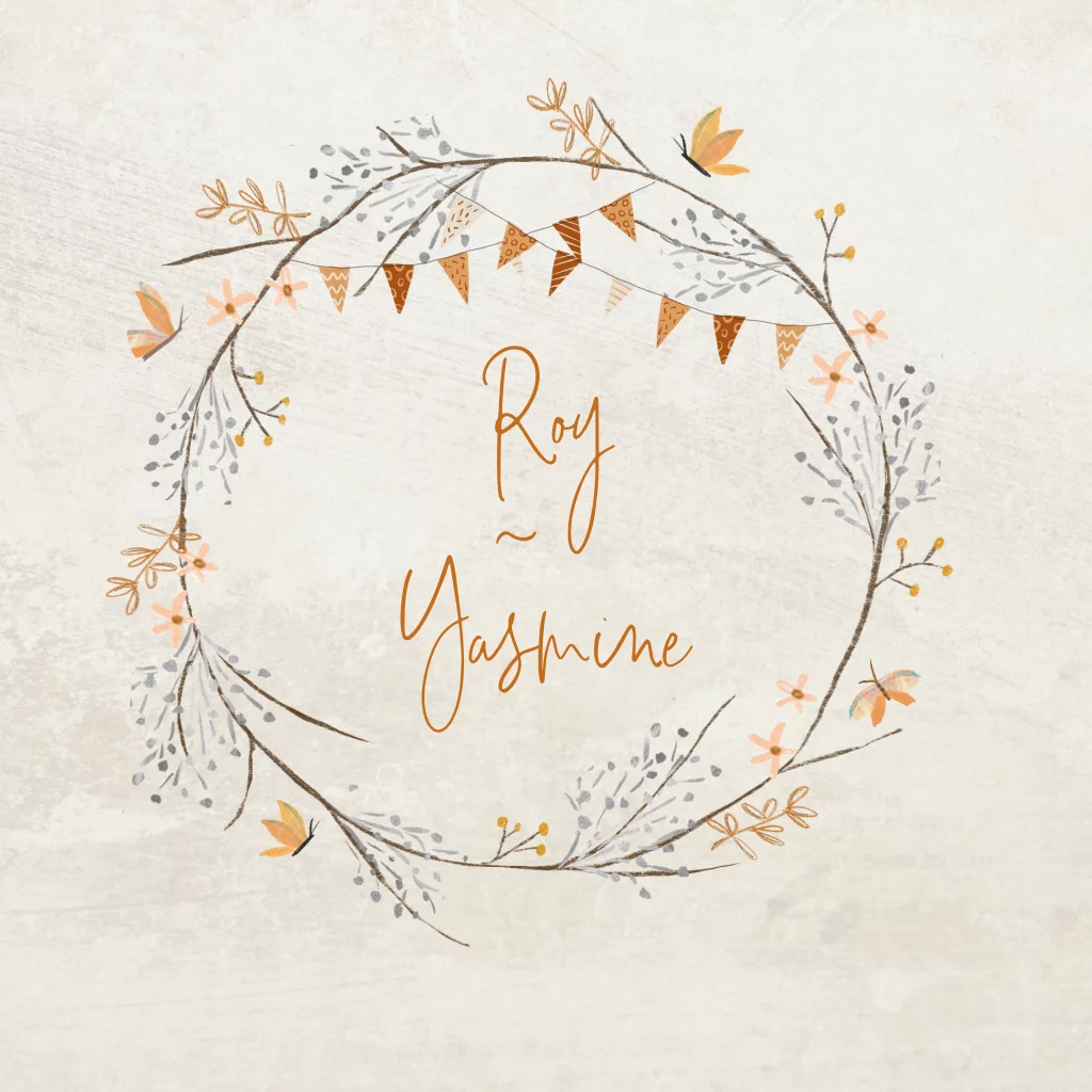 Romantische boho trouwkaart met krans van takjes, bloemen, vlinders en vlaggetjes. Met zachte, natuurlijke kleuren en een speelse, vintage uitstraling. Ideaal voor een rustieke bruiloft.