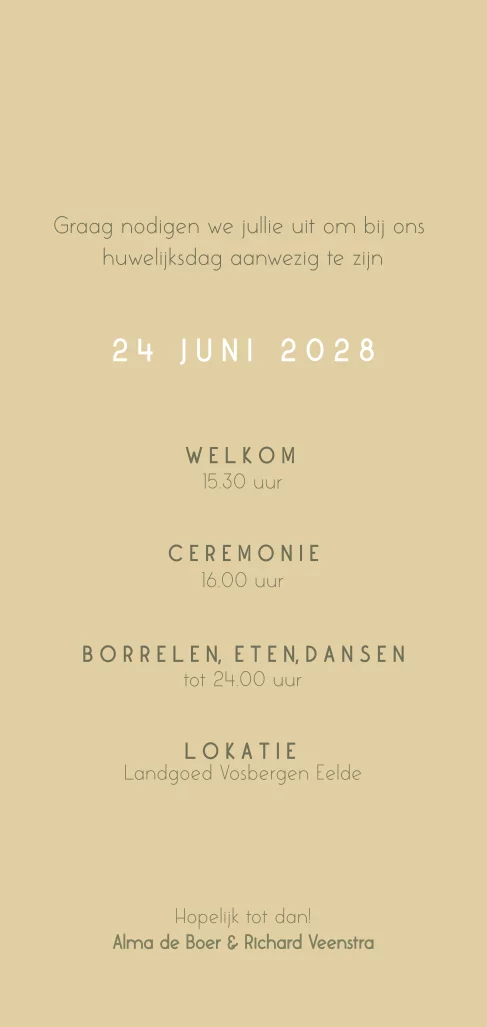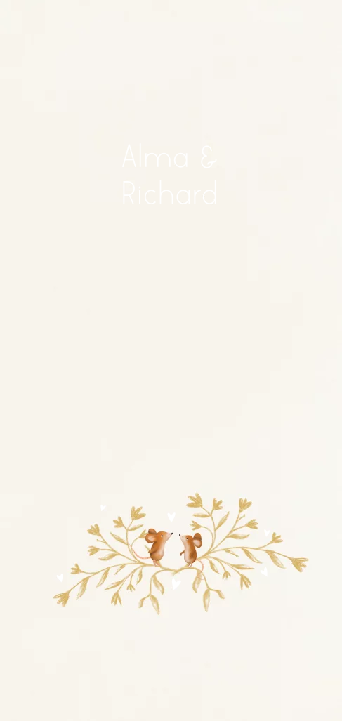 Romantische trouwkaart met schattige illustratie van twee muisjes en subtiele takjes in een minimalistische stijl met goudfolie namen. Perfect voor een sprookjesachtige bruiloft met een zachte en natuurlijke uitstraling.