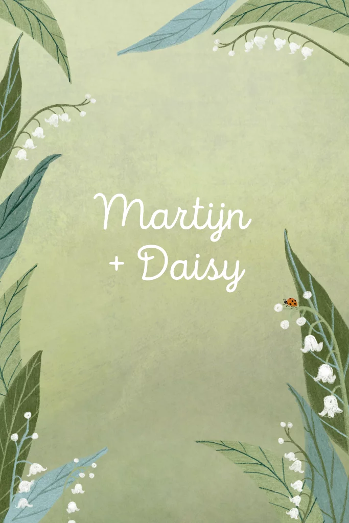 Unieke trouwkaart met groene bladeren en lelietjes-van-dalen, met een lieveheersbeestje. Deze kaart heeft een natuurlijke, lenteachtige uitstraling en is perfect voor een bruiloft in de natuur.