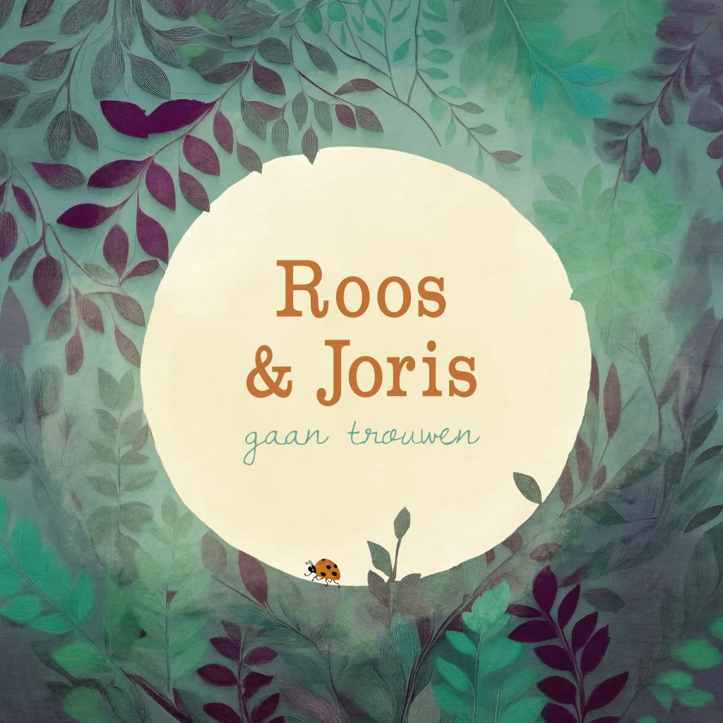 Bijzondere trouwkaart met een magische bos ontwerp van bladeren en een schattig lieveheersbeestje. In petrol, paars en groen. Roos en Joris