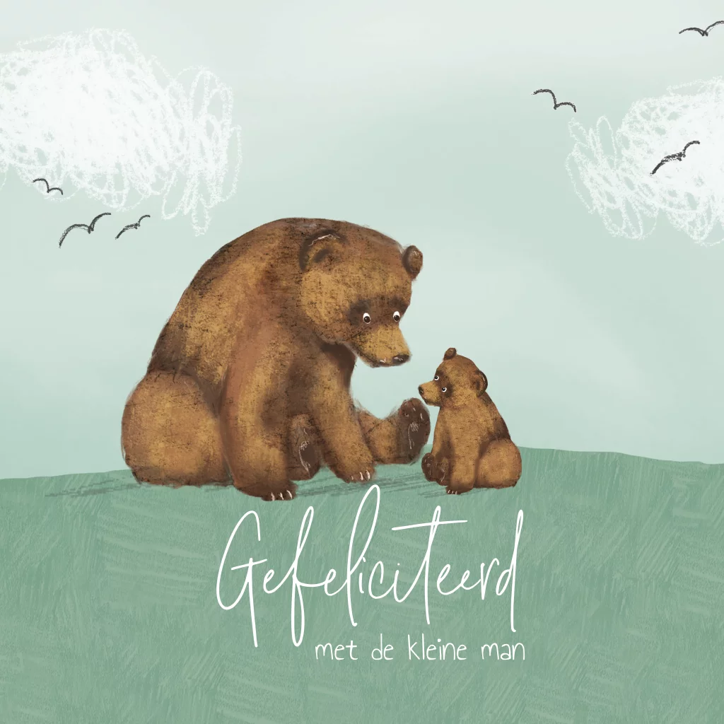 Lieve wenskaart: 'Gefeliciteerd met de kleine man' met een klein baby beertje die zijn vader/moeder aankijkt. Op een mooie groene heuvel en een blauwe lucht. Je past het kaartje gemakkelijk zelf naar wens aan.
