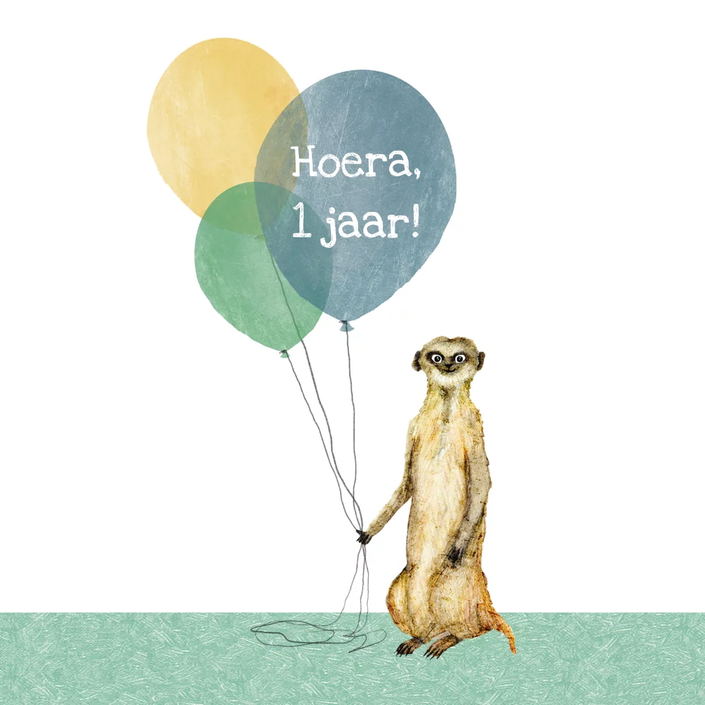 Hoera 1 (of 2,3,4,5, enz) jaar!! Het stokstaartje met gekleurde ballonnen wenst je een prettige verjaardag. Je kunt aan de binnenzijde je eigen tekst zetten.