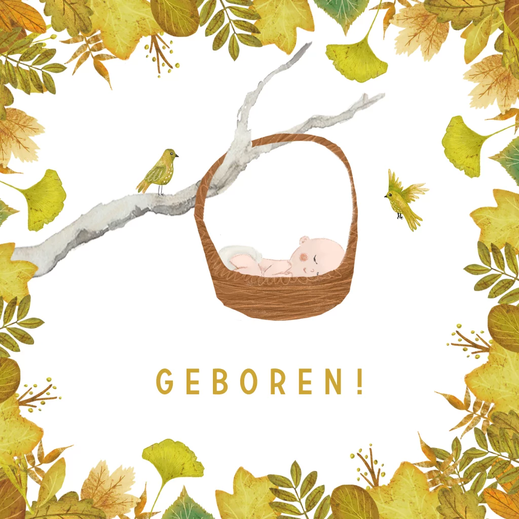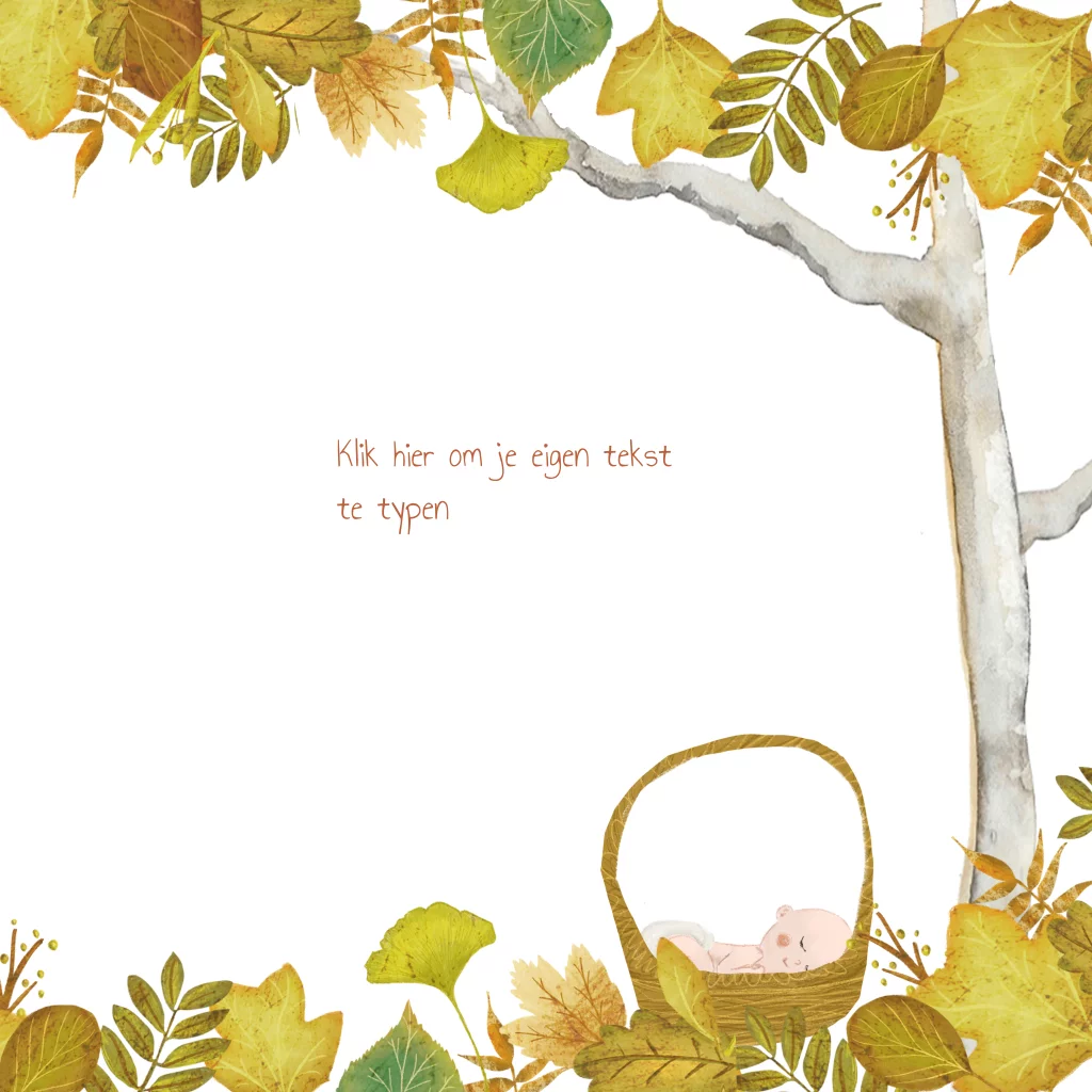 Wenskaart Geboren! met een baby in een mandje in de boom met mooie herfstbladeren in oker geel en bruin. Je kunt de bladeren ook een andere kleur geven. Kijk bij kaders in de beeldbank.