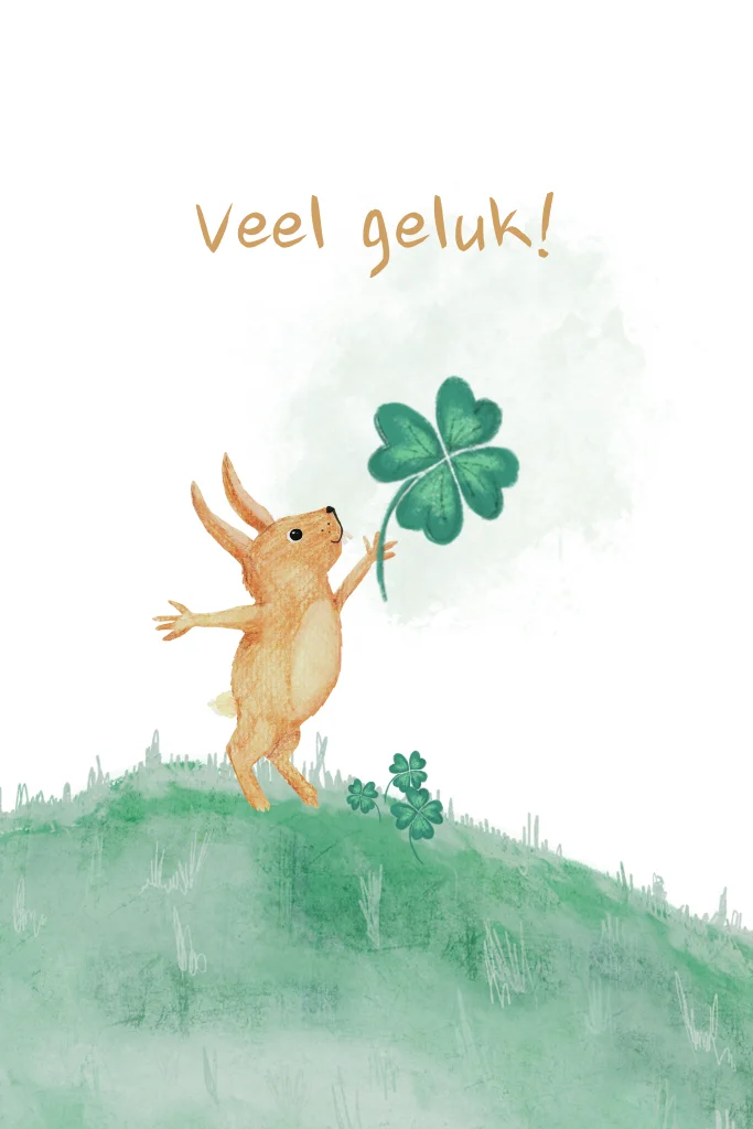 Wenskaart met tekening van haasje die een klavertje vier heeft. Veel geluk!