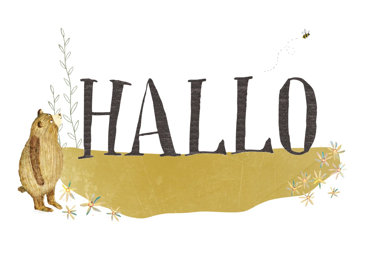 Schattig wenskaartje met de grote letters 'Hallo' en een beertje en een bijtje. Je kunt je eigen tekst schrijven in de editor.