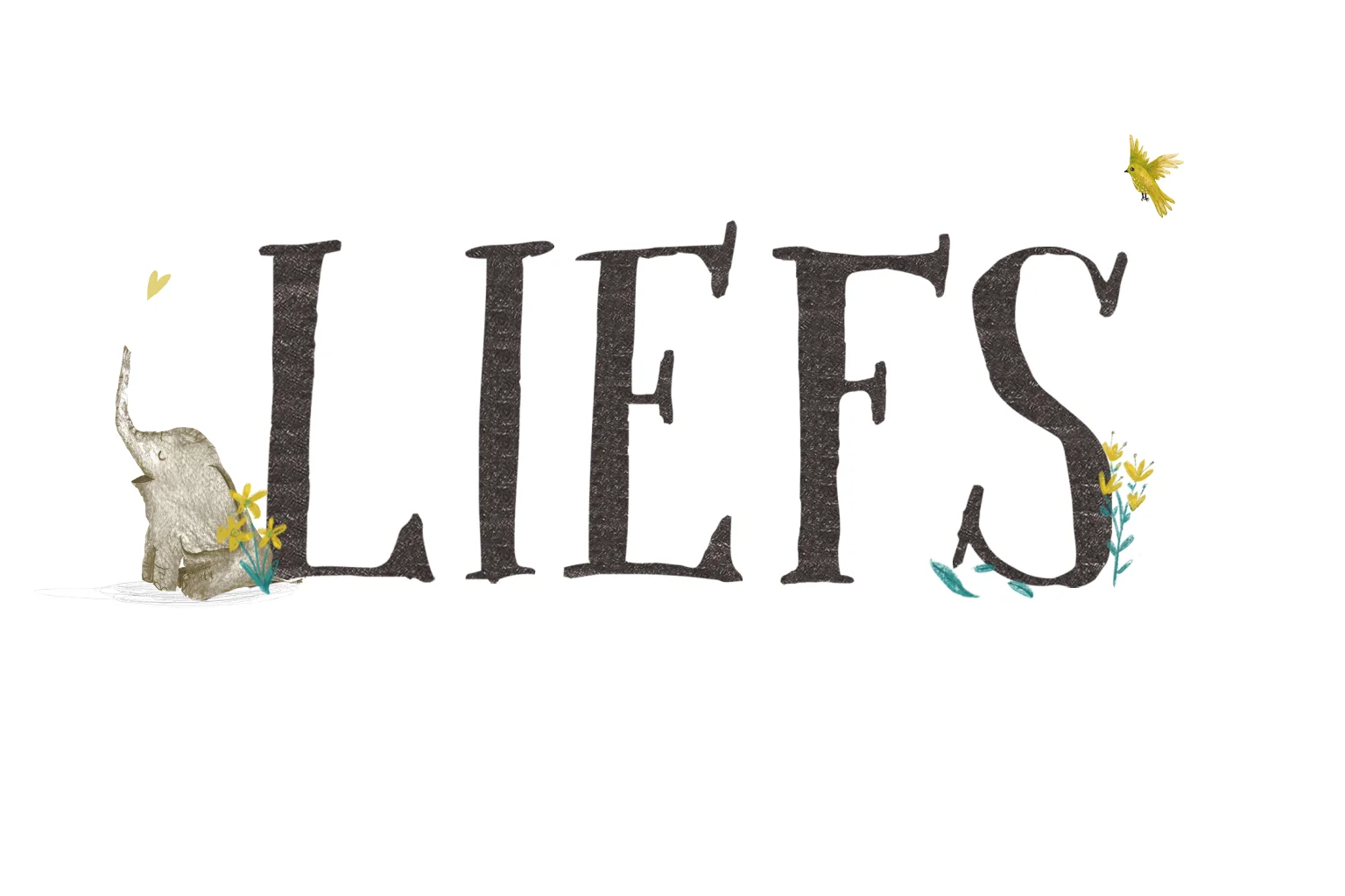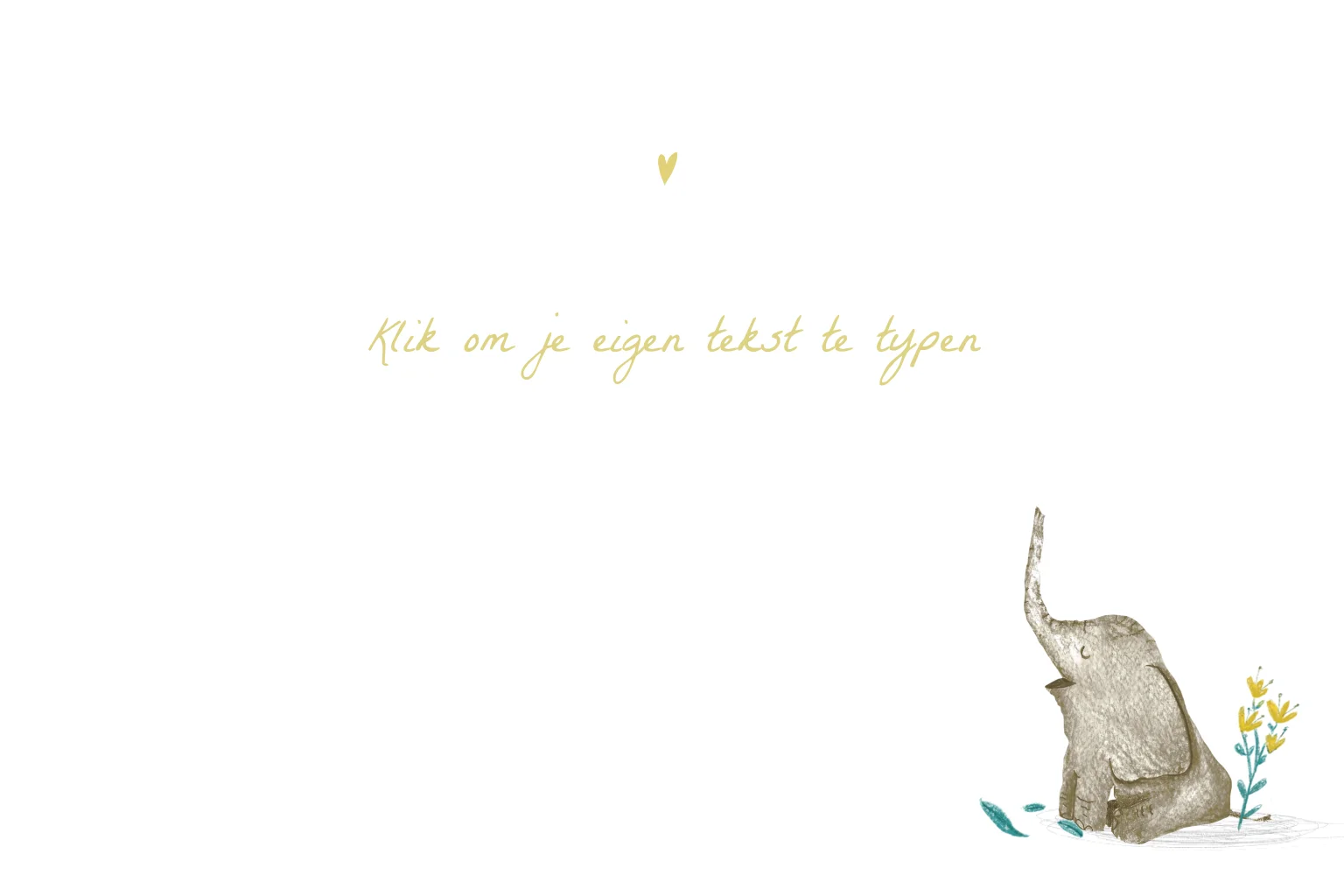 Wenskaartje liefs met grote letters en olifantje met gele bloemetjes. Je past eenvoudig zelf de teksten aan.